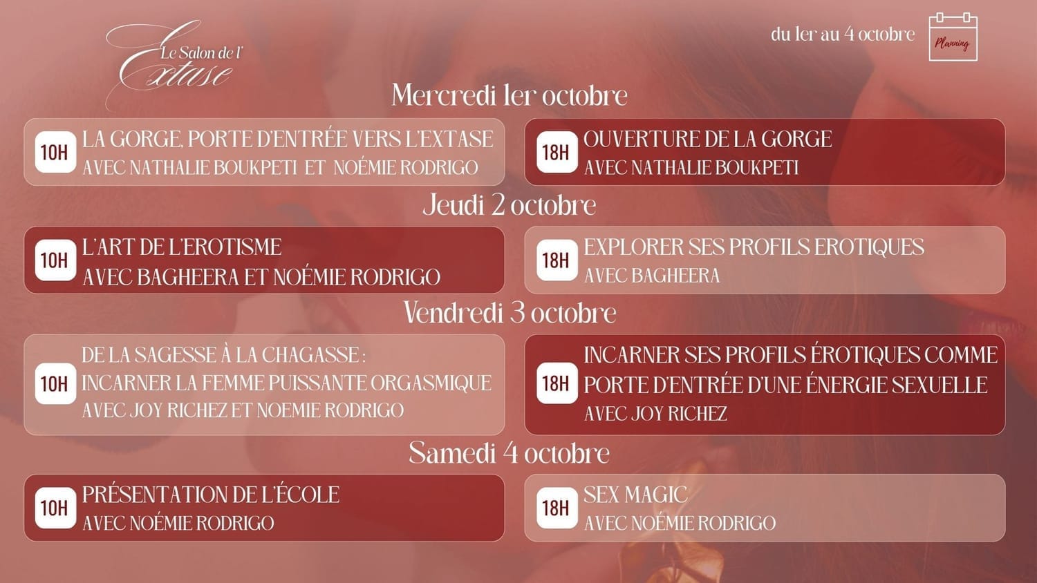 Que tu sois en couple ou célibataire, débutante ou déjà sur le chemin, le Salon de l’Extase est l’événement en ligne qui t’emmène dans les profondeurs de ta féminité, de ton corps et de ta yoni.